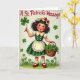 This card shows a smiling young girl centered on a soft, misty background, her rosy cheeks and dark curly hair topped with a small red bow. She wears an emerald-green dress with a white apron and bonnet, each edged with fine red stitching that feels like a thoughtful touch from a close friend 💚. In one hand she holds a large four-leaf clover, and in the other she carries a wicker basket spilling over with shamrocks ☘️. The gentle light across her face and clothes gives her an inviting, affectionate look, like she’s about to offer the clover to someone she cares about. Around her, small shamrocks drift in the air while stylized grass at the bottom suggests a dreamy meadow setting. Across the top, the title “A St. Patrick’s Message” sits in bold red cursive lettering, standing out clearly against the pale backdrop. Her shiny red Mary Jane shoes peek out beneath the hem, with scattered clovers and blades of grass framing the lower edge of the scene.