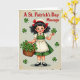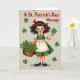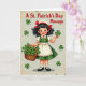 Designed with a sweet St. Patrick’s Day scene, the front shows a young girl centered in the frame, dressed in a rich green pinafore over a white apron and ruffled blouse. Her dark curls bounce around her face, tied with little red bows that match the larger red bow on her white cap, giving her rosy cheeks and wide eyes an affectionate, friendly glow 💚. In her left hand she holds a woven basket packed with three-leaf clovers, their fresh greens standing out against the basket’s tan texture. With her right hand she offers a single shamrock forward, like she’s sharing good luck with someone close ☘️. The background is a soft, aged-parchment beige with a few shamrocks floating around her, adding depth without stealing attention. Across the top, the title “A St. Patrick’s Day Message” sits in red lettering, clearly placed and easy to spot. The edges look lightly worn and distressed, framing the girl, her basket of clovers, and the scattered shamrocks on the warm beige backdrop.
