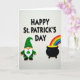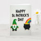 Designed with a crisp St. Patrick’s Day layout, this card features the greeting “HAPPY St. PATRICK’S DAY” across the top in black sans‑serif letters on a lightly textured white background. Beneath the headline, two scenes share the space side by side, like friendly neighbors at a party 💚. On the left stands a green-clad gnome with a star-speckled hat, a white beard marked with a shamrock, and a small rosy nose that gives him a sweet, approachable look. On the right, a rainbow 🌈 curves down into a glossy black pot filled with bright gold coins, as if it’s been set there for someone special to discover. The soft, even lighting keeps the white background gentle while letting the greens, rainbow bands, and gold details stand out clearly. The gnome faces inward toward the rainbow scene, creating a cozy, companionable connection between the two sides. Share St. Patrick’s Day sentiments with someone you care about, and enjoy the neat spacing that leaves plenty of airy white space around the top text and the two colorful illustrations.