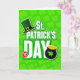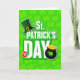 This card features a rich green St. Patrick’s Day scene that feels like an invitation to lean in close with a friend or sweetheart. Centered on the front, the words “St. Patrick’s Day” run downward in large white letters with a green outline that gives them a raised, layered look. In the upper left corner, an emerald leprechaun hat tilts at an angle, its gold buckle catching the eye like a little wink. Down at the lower right, a black pot sits heavy with gold coins, marked with a bright green shamrock ☘️. Behind everything, a repeating pattern of lighter green shamrocks fills the background, adding texture without stealing attention. A small red 8-ball pops against the greens, placed right on the “A” in “DAY,” like a cheeky shared in-joke between two people 💚. The hat’s soft shadow and the coin highlights add depth, while the shamrock pattern stays evenly spaced across the full green backdrop.