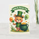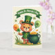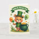 This card shows a honey-colored bear dressed like a leprechaun, standing front and center with a tender, friendly smile that feels like it’s meant for someone special 💚. The bear wears a tall emerald top hat with a gold buckle and a matching green jacket trimmed with shiny gold buttons. In its left paw, it holds a small three-leaf clover tied by a thin string to an orange balloon marked with a heart, as if it’s carrying a little note of affection through the air. To the right sits a dark green pot tipped slightly forward, spilling bright gold coins onto a patch of green grass below. Above the pot floats a lime green balloon with a shamrock on it, balancing the scene with a second pop of green ☘️. Across the top, a curved green banner carries the words “Happy St. Patrick’s Day” in light lettering that stands out against the ribbon shape. The background is a soft cream tone scattered with tiny floating shamrocks and small star-like asterisks around the bear, the balloons, and the pot of coins.