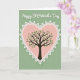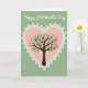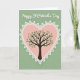 This design shows a stylized tree centered on the card, its dark, slender branches dotted with rich green shamrock leaves that feel like little tokens exchanged between close friends 💚. Some shamrocks look crisp while others fade softly like watercolor, giving the leaves a gentle, layered texture. The tree sits inside a large blush-pink heart, and the heart is ringed with a thin white lace-like border that adds a romantic, old-fashioned touch. Behind everything, a muted mint-green background keeps the scene calm and festive, like a quiet moment shared together on St. Patrick’s Day ☘️. Near the top, the words “Happy St Patrick’s Day” are placed above the heart in flowing white lettering that stands out softly against the pastel field. The contrast between the dark branches and the light background draws your eye back to the heart shape, where the clustered shamrocks suggest closeness and affection without needing any characters. Fine white edging around the heart and scattered shamrock shapes create a neat frame against the mint-green backdrop.