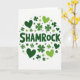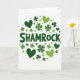 This greeting card features the word “SHAMROCK” centered in deep forest green letters, acting like the anchor for everything around it. Across a bright white background, scattered three-leaf clovers and small hearts in both forest green and lime green drift in a loose circle, as if they’re gently orbiting the title. The hearts tucked among the clovers add a sweet, friendly romance, like a quiet wink shared between two people in a crowd 💚. The alternating greens create a lively contrast, with the darker shapes feeling steady and the lighter ones adding a fresh spring lift. The text sits right in the middle, while the icons spread outward to frame it without crowding the space. Some clovers are slightly different in their leaf shapes, giving the pattern a natural, easy rhythm ☘️. The circular arrangement is made of lime-green shamrocks and hearts interspersed with darker green clovers on the white field.
