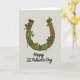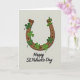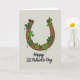 This card shows a sturdy U-shaped horseshoe in rich, dimensional brown centered on a soft light grey background, with tiny nail holes that add a touch of realism. Around it, scattered shamrocks and four-leaf clovers in deep emerald green curl and overlap, their gentle shading and small shadows giving them depth. The warm brown against the cool grey and green feels like two close friends leaning in together, cozy and easy in the same space 💚. A few clovers sit near the horseshoe’s inner curve, like they’ve been tucked there with quiet affection ☘️. Near the bottom, the words “Happy St. Patrick’s Day” appear in flowing green lettering, centered beneath the illustration. The layout stays simple and balanced, leaving plenty of open space so the horseshoe and clovers stand out. Several clovers cluster near the upper left and right edges, while a couple drift closer to the lower sides above the green text.