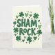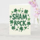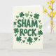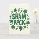 This greeting card centers on the large word “SHAMROCK” in deep emerald green, with a brushed texture that makes the letters feel lively and close. Around the text, shamrocks and hearts swirl into a loose wreath, like a circle of lucky charms gathered around a couple sharing a quiet smile 💚. The background is a soft creamy tone that lets the greens stand out, from dark forest shades to lighter lime touches that add depth. Small golden-yellow hearts are sprinkled between the shamrocks, adding a warm note that reads like a friendly wink or a gentle crush ☘️. Some hearts have dotted outlines, and the shapes vary slightly in size, giving the arrangement a relaxed, hand-drawn look. The main text sits centered and dominant, while the surrounding icons fill the space evenly, curving around it without crowding. A friendly line about sharing St. Patrick's Day sentiments.
