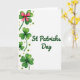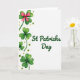 This greeting card features a white background with a vertical trail of green shamrocks running down the left side, painted with soft watercolor shading and gentle texture. Near the top, a large three-leaf clover stands out with a bright pink bow, like a sweet little gift tied on for someone special 💚. Below it, more shamrocks drift downward on curving stems, giving the layout an easy, flowing rhythm that feels like a friendly walk side by side. Small golden dots and tiny green star-shaped blossoms are sprinkled around the clovers, adding a light confetti touch ☘️. The right half stays mostly open, creating airy space that balances the busy clover border. Centered in that open area, the words “St Patricks Day” appear in dark green lettering, placed to sit comfortably in the middle. The clover column stays tight to the left margin, with the pink bow at the top and the scattered gold dots tapering outward across the white field.