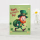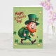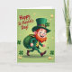 This card features a cheerful leprechaun mid-step, smiling with rosy cheeks and an auburn beard as if he’s striding over to greet a friend 💚. He wears an emerald green suit and a tall green hat with a gold buckle and a small four-leaf clover, giving him a tidy, classic look. A stuffed sack hangs from his shoulder, swinging outward like he’s just turned around to share his lucky find with you. Golden coins and little shamrocks drift across the scene, adding motion and a light, friendly energy ☘️. The background is a soft, glowing green that keeps the focus on the character while making the gold accents stand out. The greeting “Happy St. Patrick’s Day!” sits at the upper left in a thick, friendly style, standing out clearly against the green. Bright, even lighting highlights the hat buckle, coins, and the leprechaun’s raised thumbs-up. Scattered coins and shamrocks float around him while the upper-left text remains the main lettering on the front.
