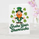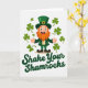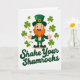 This card shows a smiling leprechaun centered on a white background, with an orange beard, rosy cheeks, and a tall green hat topped with a gold buckle. He wears a deep green outfit and holds his arms wide as if welcoming a friend in for a quick hug, adding a warm, easygoing charm 💚. Around him, shamrocks in several sizes drift across the space like confetti, giving the scene gentle movement without feeling crowded ☘️. The greens range from dark on his suit to lighter on the scattered clovers, keeping the palette lively while staying cohesive. Near the bottom, the phrase “Shake Your Shamrocks” sits in flowing dark lettering that stands out clearly against the white. The text is centered beneath the character, visually anchoring the design while the clovers float above and beside it. A few small shamrocks tuck close to his shoulders and hat brim, framing his grin and outstretched hands. Share St. Patrick's Day sentiments with someone you care about, and enjoy the crisp white backdrop sprinkled with green shamrocks around the cheerful leprechaun.