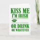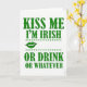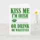 This greeting card features a white background with rich emerald lettering that reads “KISS ME I’M IRISH” centered at the top in a slightly decorated serif style, with a speckled, bubbly texture that gives the letters extra depth. Below the main line, a row of small shamrocks stretches across like a little garland, guiding your eye toward a pair of rounded green lips in the middle that suggest a cheeky kiss shared between close friends or sweethearts 💚. Another shamrock row sits beneath the lips, keeping the layout neatly stacked and easy to read. Near the bottom, the smaller phrase “OR DRINK OR WHATEVER” appears in the same green, centered, and spaced to feel casual and teasing ☘️. The overall setting stays minimal and airy, letting the green details stand out sharply against the white. The shamrocks are evenly repeated like a simple border, and the lips are the only graphic element besides the text and clovers. The lips sit centered between the two shamrock lines, matching the emerald tone of the lettering.