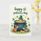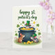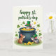 This card shows a festive St. Patrick’s Day scene with three cartoon mice gathered around a shiny, dark cauldron brimming with golden coins. A grey mouse pops up from the treasure wearing a green leprechaun hat, cheeks rosy, smiling as its pink tail curls beside the rim. A warm brown mouse leans against the pot and looks up at the mouse in the gold with a tender, admiring gaze, like a close friend sharing a private joke. On the right, another grey mouse in a tiny green top hat nudges a few scattered coins, angled toward the others as if joining in the fun. The background is a soft cream tone sprinkled with small green shamrocks and extra coins drifting around, adding a light, lucky feel ☘️. Near the top, the text “happy st. patrick’s day” sits centered in emerald green lettering, standing out clearly against the pale backdrop 💚. The gold coins glow with gentle highlights, and a few shamrocks float near the upper corners.
