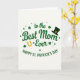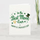 This card features an off-white background with a curved headline reading “to the Best Mom Ever” in rich green lettering, setting a cozy, affectionate tone 💚. Beneath it, “HAPPY ST. PATRICK’S DAY” follows a matching arc in the same green, creating a neat, balanced layout. Small shamrocks and tiny starburst-like marks are scattered around the text like confetti, adding a light, friendly energy ☘️. A green leprechaun hat sits at an angle near the top, and its golden buckle catches the eye with a warm shine. The overall look leans on simple spacing and lots of open background, letting the green and gold details feel extra special. Inside the word “Ever,” a gold horseshoe is tucked in as a lucky accent, giving the message a gentle, caring emphasis. The horseshoe has a metallic look that stands out against the green letters, with shamrocks floating nearby and the tilted hat above.