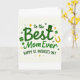 This card features a creamy off-white background with emerald-green lettering that reads “to the Best Mom Ever” centered large, like a gentle hug in words 💚. A small green leprechaun hat with a gold buckle sits on the first “t” in “Best,” adding a cheeky wink above the line. Below, “HAPPY ST. PATRICK’S DAY” appears in green and is set at a slight angle, giving the layout an easy, friendly motion ☘️. Shamrocks in several shades of green are sprinkled around the message, filling the open space like confetti without crowding the text. Golden stars—some filled, some outlined—glimmer between the letters and around the edges, echoing the warmth of a close, caring bond. Near the word “Ever,” a single gold horseshoe rests like a lucky charm tucked beside the message. The overall palette stays in greens and golds, with the decorations orbiting the centered words on the soft off-white field. Golden stars and scattered shamrocks frame the green text while the tiny hat perches above the “t,” and a gold horseshoe sits near “Ever.”