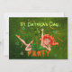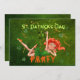 Fun Irish party invitation features a background of rich green shamrocks Lucky shamrocks, streamers and confetti pop out from a green top hat held up by a pretty redhead Irish lady reclining on Party text art. Card back has matching shamrock pattern with top hat accent banner. Customize back of this St. Patrick's Day party invitation with your information.