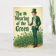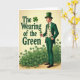 This St. Patrick's Day card features a well-dressed gentleman on the right in an emerald green suit, with a white shirt, green tie, and a waistcoat covered in tiny shamrocks 💚. He wears a tall green top hat and holds a single shamrock lightly in his right hand, while his left hand rests in his pocket as if he’s posing for someone he wants to impress. The warm, creamy background gives the greens a gentle glow, like soft lamplight on a festive evening. On the left side, the phrase “The Wearing of the Green” appears in large, dark green lettering, with a small shamrock accent tucked near the words ☘️. Across the bottom, a thick patch of three-leaf clovers spreads like a garden carpet, rising slightly to frame his legs and anchor the scene. The careful tailoring, the neat tilt of the hat, and the shy little shamrock in his hand suggest an affectionate, friendly kind of charm without needing any extra fuss. The overall layout stays balanced, with text on the left, the figure on the right, and layers of clovers filling the foreground against the creamy backdrop.