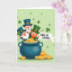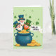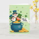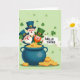 Designed with a cheerful St. Patrick’s Day scene, this card centers on a rounded blue pot spilling shiny gold coins. Three friendly little figures pop up from the treasure, their rosy cheeks and wide eyes giving them the kind of sweet, close-knit look you’d share with someone you adore 💚. Two wear tall blue top hats and fluffy white beards, while the middle character has a bright red beard and a green hat that ties into the holiday theme ☘️. One figure lifts a four-leaf clover as if showing it off to a favorite person, and the red-bearded friend holds a small banner like an eager hello across the room. The words “HELLO THERE” sit on that banner in clear, easy-to-read lettering, standing out against the lighter banner color. Behind them, a soft pastel green background keeps things light, dotted with small shamrocks and tiny orange accents. Gold coins scatter along the bottom edge with a metallic shine, and a few shamrocks float around the top area.