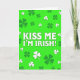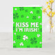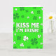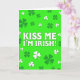 This card features a bright green background that sets a flirty, friendly St. Patrick’s Day scene 💚. Centered on the front, the phrase “KISS ME I’M IRISH!” sits in large white sans‑serif letters with a faint shadow that gives the words a little lift. The message feels like a cheeky invitation, like two friends leaning in close for a laughing photo or a couple sharing a quick kiss at a party. Scattered all around, shamrocks tumble across the space in different sizes and angles, keeping the layout lively ☘️. Some clovers appear as darker green shapes that sit back in the background, while others are white with soft shading that makes them look slightly raised. The contrast between the green field and the white elements helps the text stay easy to spot at a glance. White clovers and darker green clovers alternate across the corners and edges, framing the centered wording.