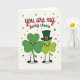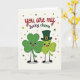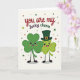 This card features two smiling shamrocks in bright green standing close together on a creamy off-white background, their wide eyes and pink cheeks making them look like they’re sharing a sweet, private joke 💚. The shamrock on the right wears a dark green leprechaun hat with a shiny gold buckle, leaning slightly toward its friend as if posing for a photo. Above them, the words “you are my lucky charm” sit near the top, with “you are my” in rich red and “lucky charm” in a green with a subtle purple tint. The lettering stretches in a smooth, flowing line across the upper area, leaving the pair centered and easy to notice. Around the shamrocks, small star shapes in red, green, and gold are scattered like confetti, adding a festive sparkle ☘️. The open smiles and close spacing give the scene a gentle romantic or best-friends feel without needing anything else in the background. The hat’s buckle catches the eye with a neat gold rectangle, and the stars dot the space above and around the characters.