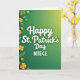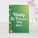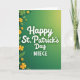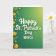 This greeting card features a festive St. Patrick’s Day scene with “Happy St. Patrick’s Day” in large white flowing lettering centered near the top, set against a green gradient that shifts from deep emerald at the bottom to lighter lime toward the upper right 💚. Just below, “NIECE” sits in all-caps white letters, with small white arrows pointing inward from both sides to give it a close, affectionate focus. Along the left edge, layered shamrocks and four-leaf clovers cascade downward like a garland, mixing rich greens with touches of golden-orange that feel like little sparks of attention ☘️. Their soft drop shadows make each piece look slightly raised, adding depth as if the shapes were gently placed on the surface. Between the clovers, small orange dots scatter like confetti, keeping the eye moving and adding a light, friendly energy. Fern fronds curl in among the leaves, framing the message and creating the sense of a shared celebration between you and your niece. The background glow brightens toward the top right, while the densest cluster of clovers and orange accents stays anchored along the left side.