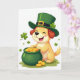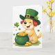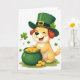 This greeting card features a golden-yellow puppy centered on a white background, smiling with closed eyes and rosy cheeks as if laughing at a friend just off to the side. It wears a tall emerald-green leprechaun hat with a dark band, a gold buckle, and a tucked shamrock ☘️. The puppy hugs a deep green pot with both paws, giving the scene a cozy, affectionate feel, like it’s sharing its lucky find with someone special. Gold coins spill over the rim and tumble onto the lightly shaded ground, their star marks catching small highlights. Around the puppy, small green shamrocks float at different sizes, adding gentle motion and a flirty, festive spark 💚. The greeting “Happy St. Patrick’s Day” sits near the top in green lettering, with a smaller line beneath it in gold for contrast. The coins are round and shiny, and several rest in a loose scatter near the base of the pot.