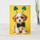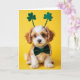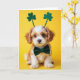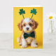 This card features a small white-and-ginger puppy sitting right in the center, posed against a smooth, sunny yellow background that keeps all attention on its face. Its fluffy coat looks extra soft under warm lighting, and its big dark eyes hold a tender, trusting look that feels like a quiet moment shared with a close friend. A dark green bow tie rests neatly at its neck, adding a dressed-up touch without looking stiff. On its head are shamrock antennae topped with strands of green beads, giving the pup a fun St. Patrick’s Day look ☘️. The greeting text sits above the puppy in green, with a smaller line below in matching green to balance the layout 💚. Deep greens stand out sharply against the yellow backdrop, making the bow tie and shamrocks pop. The background stays plain and even, with no other objects, just the puppy and its green accessories against the bright field of yellow.