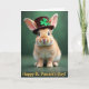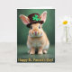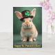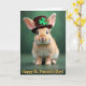 This design shows a small golden-tan rabbit sitting in front of a softly blurred green garden backdrop, with a gentle glow that makes its fur look extra plush. A tiny brown top hat rests between its ears, decorated with bright green shamrocks for a St. Patrick’s Day touch ☘️. The rabbit’s wide dark eyes and little rose-pink nose give it a tender, inviting look, like it’s quietly sharing a sweet moment with someone just off-camera 💚. Fine white whiskers fan out and catch the light, adding delicate detail around its face. Near the bottom, the words “Happy St. Patrick’s Day!” appear in gold lettering, centered and easy to spot without taking attention away from the rabbit. The scene feels calm and affectionate, with the soft background making the rabbit look like the gentle focus of a friendly celebration. Share St. Patrick’s Day sentiments with someone you care about.