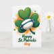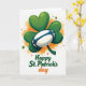 This design shows a deep green three-leaf shamrock centered on a bright white background, with a white rugby ball tucked neatly inside its curves like it belongs there. Blue stitching on the ball adds a crisp accent, and the gentle shading around both shapes gives them a slightly raised, almost touchable look. Around the main image, tangerine-orange paint splatters burst outward, creating a lively setting that feels like friends cheering from just off the page. Small shamrocks in green and orange are scattered among the splashes, like little nods exchanged between teammates. Near the bottom, the text “Happy St. Patrick’s day” sits as a clear anchor, with the lettering split between green and orange for a balanced, festive contrast. A couple of tiny details in the orange marks and mini shamrocks add extra charm without crowding the center, and a subtle ☘️ and 💚 mood comes through in the color pairing. The overall layout keeps the shamrock and rugby ball in the middle, framed by the radiating orange splatter and the small shamrock icons drifting around it.