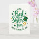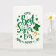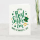 This card features a white background with emerald-green lettering that reads “TO THE Best Sister Ever” centered large in the middle, giving the message a close, affectionate focus 💚. Around the words, small shamrocks in a few shades of green are scattered like confetti, adding a light, friendly energy ☘️. Near the upper area, a green leprechaun hat tilts to the right, trimmed with a black band and a gold buckle that catches the eye. Below, a gold horseshoe sits like a lucky charm, dotted with dark nail holes and surrounded by tiny gold starbursts. The layout feels like a sisterly note dressed up for the holiday, with the decorations nestled close to the text as if they’re gathered around it. Along the bottom, “HAPPY ST. PATRICK’S DAY” appears in green and curves in a gentle arc beneath the main line. The overall look stays airy and bright, with the green and gold details standing out crisply against the white. The hat angles right above the lower decorations while shamrocks and starbursts float around the central lettering.