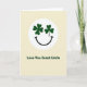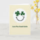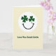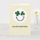 This greeting card features a pale cream background with a white circle centered near the top, like a simple badge floating in open space. Inside the circle, a friendly smiling face appears, with two deep emerald shamrocks as the eyes and a thick curved black line forming the smile ☘️. The shamrock “eyes” feel like they’re looking out with an easy, affectionate gaze, as if sharing a private joke with a favorite great uncle. Beneath the circle, the message “Love You Great Uncle” sits centered in a bold sans-serif font, colored the same rich green as the shamrocks 💚. The spacing is roomy and balanced, keeping the focus on the face above and the words below without any extra clutter. Strong contrast between the green details, black smile, and light background makes everything easy to notice at a glance. The white circle stays crisp against the cream field, with the green shamrocks placed evenly as eyes above the smooth black curve of the grin.