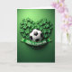 This card features a black-and-white soccer ball centered inside a heart made from many plump three-leaf shamrocks in layered shades of green, set against a deep emerald background that darkens toward the edges. The shamrocks overlap like a close-knit crowd, giving the heart a cozy, affectionate look that suggests friendship shared over a favorite match 💚. Beneath the ball, a draped green ribbon banner curves across the lower portion, adding a gentle sense of movement. The words “Happy St. Patrick’s Day” sit on the ribbon in white lettering, standing out clearly against the green. Soft lighting adds small highlights along the ribbon folds and the ball’s panels, while faint shadows tuck between the shamrocks for extra depth. The mix of sporty energy and Irish tradition feels like two people leaning into the same celebration, side by side ☘️. The heart of shamrocks frames the ball tightly, with the ribbon arcing just below and the darkest green shading pooling in the corners.
