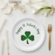 St. Patrick's Day paper plate, with a green shamrock design on a white background. With green typography lettering, you can customize with your own text. Great for enjoying a Happy St. Patrick's Day.