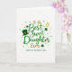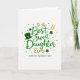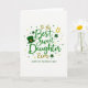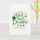 This card features a bright white background with a centered message that reads “To the Best Sweet Daughter Ever,” arranged like a loving dedication. “Best Sweet Daughter” appears in rich emerald green, while “To the” above and “Ever” below are set in metallic gold for a clear contrast. Under the main line, “HAPPY ST. PATRICK’S DAY” sits in smaller, simple lettering in dark green, keeping the layout neat and easy to read. Around the text, dark green shamrocks mingle with tiny gold dots and small four-point gold starbursts, like little sparks scattered across the space 💚. A dark green leprechaun hat with a bright gold buckle rests to the left of the wording, adding a friendly, celebratory touch ☘️. Near the upper right, a gold horseshoe balances the composition and draws the eye upward. The overall scene is framed by the mix of green icons and gold accents floating on the white field, with the hat on the left and the horseshoe near the top right.