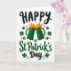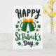 This St. Patrick's Day card features a festive white background sprinkled with shamrocks in dark green, lighter green outlines, and a few small orange ones for contrast ☘️. At the top, the word “HAPPY” sits in deep green lettering, with “St. Patrick’s Day” placed just below it in the same green. In the center, two sturdy deep-green beer steins tilt toward each other as if sharing a friendly toast, their closeness hinting at easy camaraderie. Each mug is filled with bright orange beer and thick golden foam that rises high and spills outward in lively splashes. The orange bursts arc around the clinking point, like a cheerful spark between the two drinks 💚. The shamrocks float around the scene in varied sizes, framing the mugs without crowding them. Fine droplets and curved splash shapes radiate from the overflowing foam against the white space. End with a friendly line about sharing St. Patrick's Day sentiments.