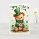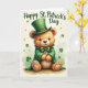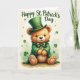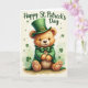 This card features a single teddy bear centered on the front, dressed up for St. Patrick’s Day with a sweet, affectionate look in its shining eyes 💚. The bear’s soft brown fur is finely textured, and its gentle smile feels like it’s meant for a close friend or someone you adore. It wears an emerald green top hat with a gold buckle, along with a matching green coat and a neatly tied bow tie. A tiny ornate gold key hangs from the bow tie, adding a small romantic “secret keepsake” touch to the outfit. Soft, diffused lighting gives the whole scene a cozy glow, while small shamrocks and pale green watercolor wisps float around the bear ☘️. Across the top, the words “Happy St. Patrick’s Day” curve in a dark green flowing font, framing the character without covering it. The background stays light and airy, with scattered shamrocks and gentle green washes surrounding the bear.