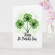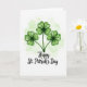 This card features three stylized shamrocks painted in watercolor, clustered near the upper middle of a tall white layout, like close friends leaning in together 💚. Each shamrock is made of multi-lobed leaves with fine veins, and the leaves tilt toward one another in a way that feels gently affectionate. The greens shift from light lime highlights to deeper emerald shadows, giving the foliage a soft, rounded depth. Thin, dark stems drop straight down from the cluster, guiding your eye toward the message below. Behind the leaves, pale green washes and scattered splatters drift across the white background, adding an airy, springlike setting without distracting from the main shapes ☘️. Centered beneath the stems, the text “Happy St. Patrick’s Day” appears in flowing black lettering, with the words stretching horizontally across the lower portion of the card. The darkest green shadows gather along the leaf edges, while the lighter tones glow near the centers, and the background speckles fade outward around the shamrocks.