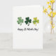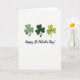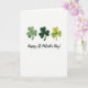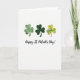 This card features three watercolor-style shamrocks lined up across the upper middle of a bright white background, giving the layout an easy, balanced look. The left shamrock is a light, translucent emerald, the middle one is a deeper forest green, and the right one mixes chartreuse with warm golden yellow, like a small wink of sunshine ☘️. Together they feel like three friends standing shoulder to shoulder, close enough to share the same space while still showing their own character. Beneath them, the words “Happy St. Patrick’s Day!” sit centered and slightly lower on the page in flowing black lettering. The dark text stands out clearly against the open white space, leaving the greens to feel soft and airy 💚. The wide margins and uncluttered background keep your eye moving gently from the shamrocks down to the greeting. The rightmost shamrock has the brightest yellow touches, with watery edges that fade softly into the white.