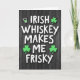 This greeting card features the cheeky phrase “IRISH WHISKEY MAKES ME FRISKY” stacked in big white letters across a charcoal-gray wooden plank background with visible grain. The words sit centered and tall, with each line arranged one under the other so the message reads like a friendly toast shared across a pub table. Soft shadowing behind the letters makes them look slightly raised, as if laid on the wood for someone special to spot and grin at. Above the first word, a simple whiskey glass tilts at an angle, filled with bright green liquid that adds a flirty wink to the scene. Three emerald shamrocks ☘️ in the same green are placed as accents—one near “IRISH” and two framing the lower lines—like little lucky charms passed between close friends. The white text stays crisp against the dark boards, while the green details 💚 pop like fresh clover against dusk. The background remains a deep, weathered gray with plank seams and textured knots running behind the centered lettering.