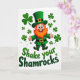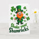 This card features a cheerful cartoon leprechaun centered on a bright white background, dressed head to toe in rich green with a tall hat, a shiny buckle, and matching boots. His bright blue eyes and wide grin sit above a full orange beard, and his open arms and lifted feet make him look like he’s dancing right toward you with an easy, friendly charm 💚. Around him, shamrocks in several sizes drift and tumble through the air, adding movement like confetti at a party ☘️. The green tones stand out sharply against the white space, while the orange beard adds a warm contrast that draws your eye back to his face. Beneath the figure, the phrase “Shake your Shamrocks” curves across the lower portion in green lettering, following a gentle arc. The layout keeps the character as the main focus, with the scattered clovers framing him rather than crowding him. Several small shamrocks hover near his hat and shoulders, with a few falling closer to the curved green text at the bottom.