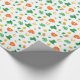 Wrapping paper for St Patrick's Day with a pattern of orange beards, leprechaun hats, gold coins, shamrocks, Irish flags, and horseshoes.