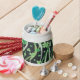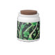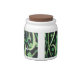 White Porcelain candy jar with a whimsical image of shamrocks on the wind with an occasional four-leaf clover for good luck, on black. See matching espresso cup, flask, mug, pitcher, paper plate, teapot and coasters. See the entire St. Patrick's Day Candy Jar collection in the FOOD/BEV | Dishes section.