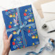 Great pattern for wrapping Rosh Hashanah gifts. Shana Tova with traditional Jewish symbols on navy blue background.