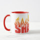 Two-tone mug printed with flaming name of Orisha Shango name. Text with flames design in red, orange and yellow.