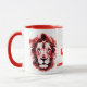 Two-tone mug printed with iconic S and Orisha Shango name. Text with cowrie design between two lion heads in red and black.