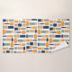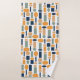 This towel set has a bath towel with a mid-century modern design of ovals and rectangles in patterns repeating in the design, a gold washcloth, and a blue hand towel.