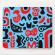 A mouse pad with an unusual abstract design made up of strange surreal shapes in red and black. Inspired by retro modern design.
