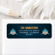 Cute shark themed return address labels feature orange and white lettering on a navy blue ocean background with two smiling blue sharks. Designed to coordinate with our Shark Bait birthday collection.