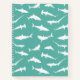 Awesome notebook printed with a graphic design of a frenzy of sharks. White sharks swimming on a blue background. The design includes Hammerheads, Tiger Sharks, Great Whites and Threshers.