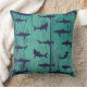 Cool cushion printed with silhouettes of a school of different sharks, on a blue weathered wood background.