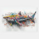 This captivating image showcases a three-dimensional rendering of a shark suspended in mid-air within an industrial or warehouse setting. The shark’s body is adorned with vibrant graffiti art, featuring a mix of colors, shapes, letters, and patterns, giving it a dynamic and urban aesthetic. The large windows in the background allow natural light to flood the space, reflecting off the glossy floor and highlighting the shark’s colorful exterior. This unique blend of street art and marine life creates a powerful visual contrast, making it a standout piece.