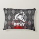 This unusual decorative accent pillow features a white pictogram of a great white shark on a black, grungy argyle background that is spattered with a red stain! Is it blood? Or ketchup? The customizable text below the shark says "BITEY," but can be changed to whatever you like!