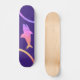 A skateboard deck with a rainbow shark on a purple background. The shark and curved lines have a rainbow glitter look. (The glitter is a simulated image and not actual foil glitter)